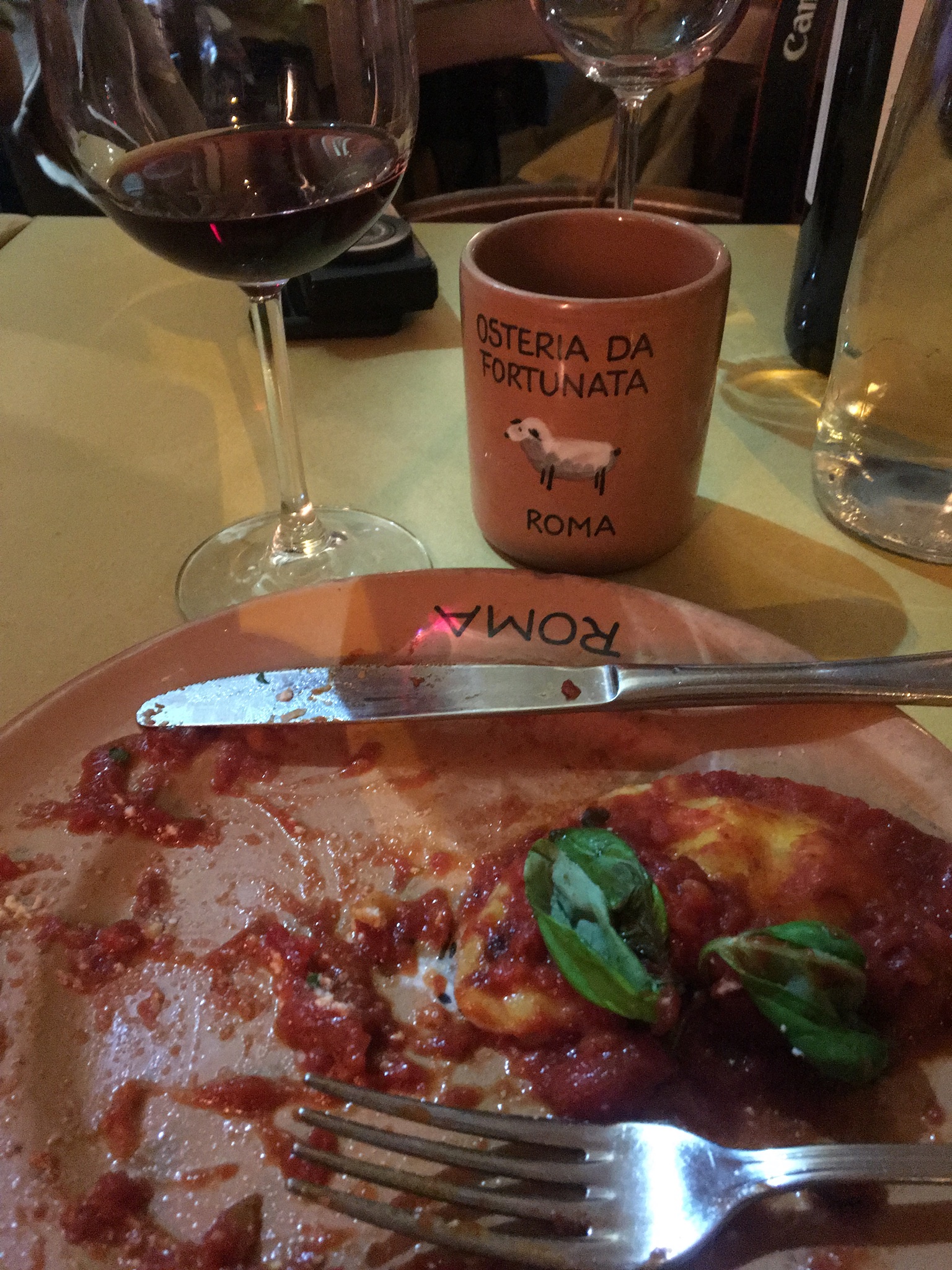 The next night – our last in Rome – capped another long day that began with a three hour tour of the Vatican, the Sistine Chapel and St. Peter’s Basilica, and continued on to several city highlights including the Trevi Fountain and the Spanish Steps. By the time dinner rolled around, it was late and I was ill-tempered. We had an early wake up call – Jen’s mother was returning to Chicago and the rest of us were traveling on to the Amalfi Coast – and the wait was long at the restaurant recommended by our hotel. We debated back and forth for a good twenty minutes, when suddenly, a busy waiter hustled over, threw down a yellow table cloth, and set a table for five. Decision made.